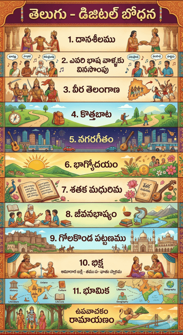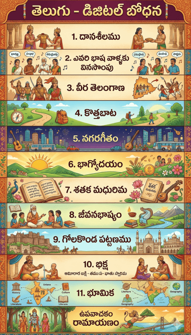 10వ తరగతి బోధించే ఉపాధ్యాయులకు మరియు విద్యార్థులకు ఉపయోగపడే డిజిటల్ పాఠ్యాంశాలను క్రింద లంకెల్లో పొందుపరచడం జరిగింది. వీటిలో ప్రతి పాఠానికి సంబంధించి సామార్థ్యాల వారిగా పాఠ్యాంశ వివరణ, చిత్రాలు, ముఖ్యమైన పదాలకు అర్థాలు, పద్య ప్రతిపదార్థ తాత్పర్యాలు, ప్రశ్నలు జవాబులు, భాషావ్యాకరణాంశాలు, అదనపు సమాచారం వంటివి అందించడం జరిగింది.